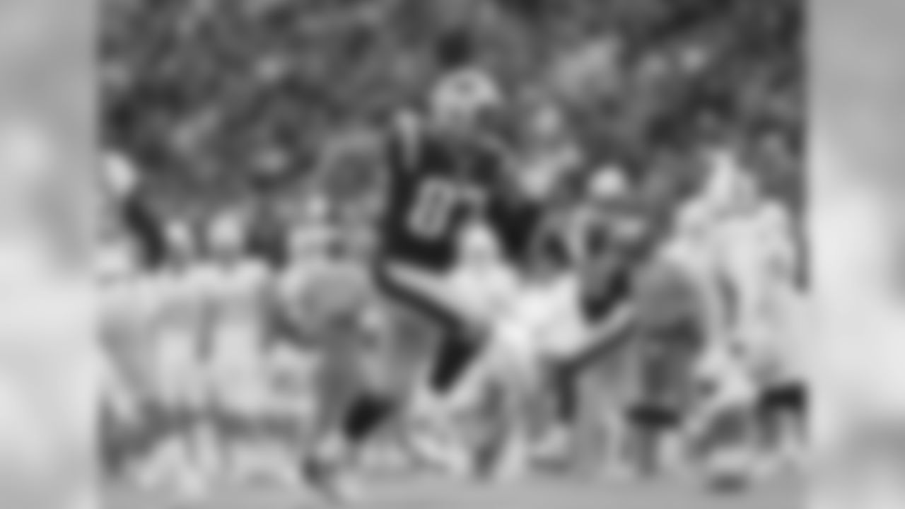 New England Patriots tight end Rob Gronkowski runs after a catch against the Houston Texans during an NFL football game at Gillette Stadium in Foxborough, Mass. Sunday, Sept. 24, 2017. (Winslow Townson/AP Images for Panini)