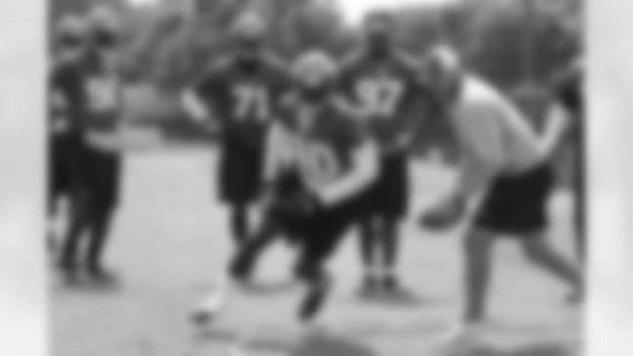Rookie DE Jarriett Buie goes into a heavy lean as he heads toward the QB tackling dummy