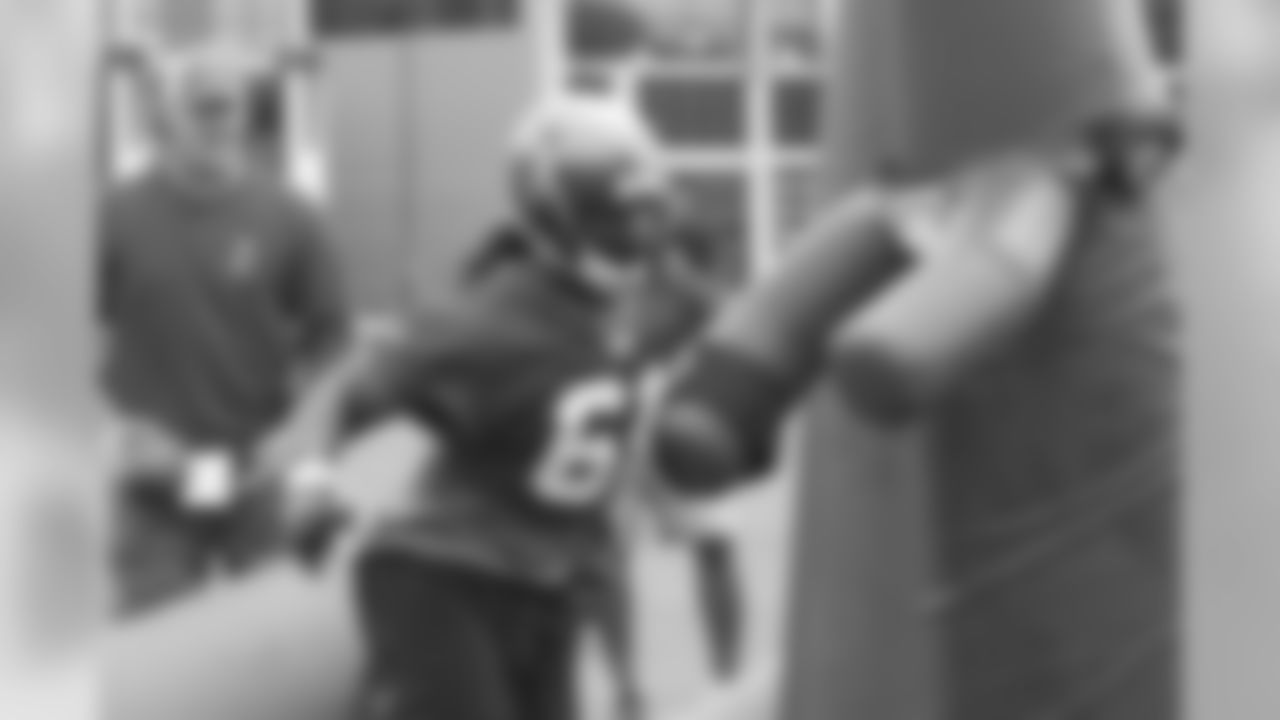 LB Geno Hayes starts into a backpedal during a footwork drill