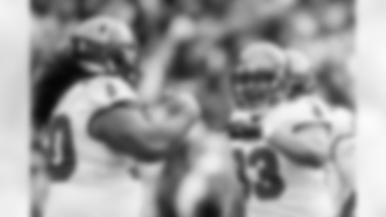 LANDOVER, MD - November 14, 2021 - Safety Antoine Winfield Jr. #31, Safety Mike Edwards #32, Cornerback Pierre Desir #29, and Outside Linebacker Anthony Nelson #98 of the Tampa Bay Buccaneers celebrate during the game between the Tampa Bay Buccaneers and Washington Football Team at FedEx Field. Washington Football Team won the game, 29-19. Photo By Kyle Zedaker/Tampa Bay Buccaneers