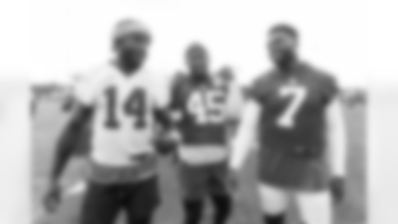 EAST RUTHERFORD, NJ - August 17, 2023 - Wide Receiver Chris Godwin #14, Inside Linebacker Devin White #45, and Outside Linebacker Shaquil Barrett #7 of the Tampa Bay Buccaneers during 2023 Training Camp practice at the New York Giants training facility. Photo By Kyle Zedaker/Tampa Bay Buccaneers