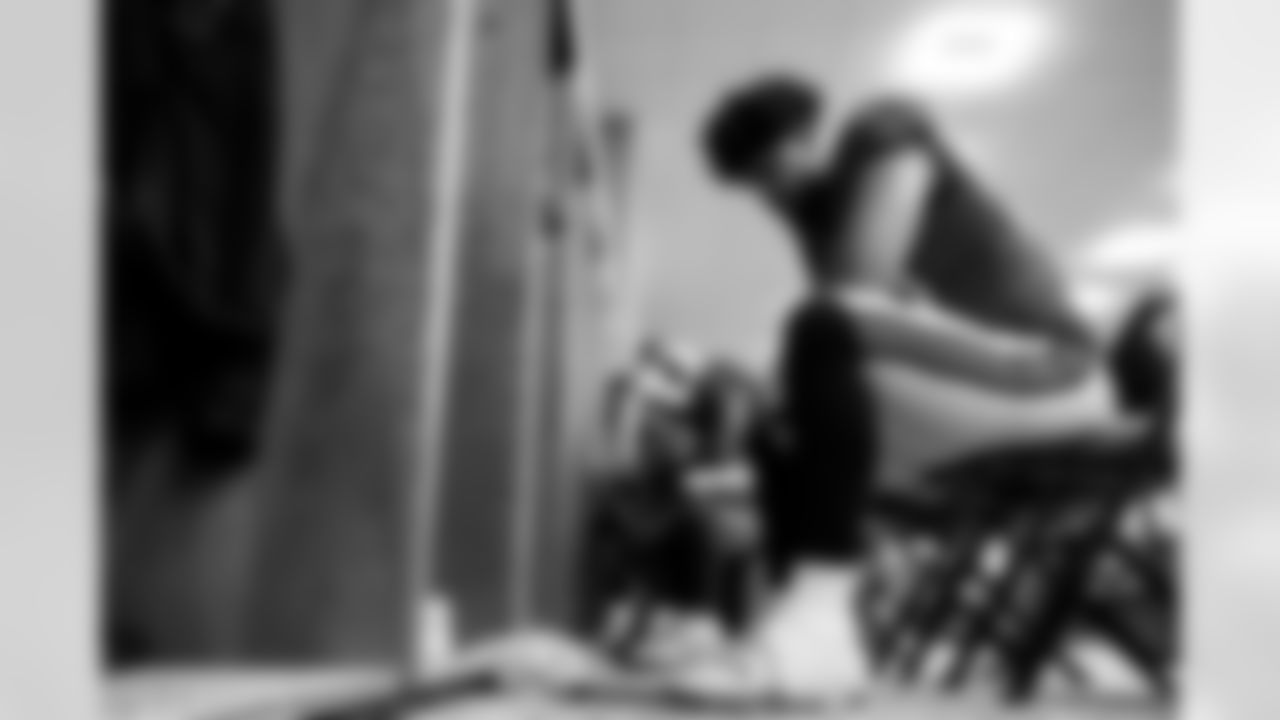 TAMPA, FL - October 21, 2024 - Safety Kaevon Merriweather #26 of the Tampa Bay Buccaneers' cleats before the Monday Night Football game between the Baltimore Ravens and Tampa Bay Buccaneers. The Bucs lost the game 31-41. Photo By Kyle Zedaker/Tampa Bay Buccaneers