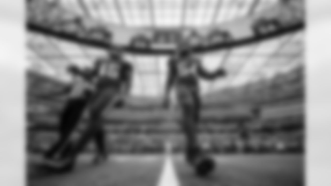 PHILADELPHIA, PA - October 14, 2021 - Inside Linebacker Kevin Minter #51 and Wide Receiver Mike Evans #13 of the Tampa Bay Buccaneers before the game between the Tampa Bay Buccaneers and Philadelphia Eagles at Lincoln Financial Field. The Buccaneers won the game, 28-22. Photo By Kyle Zedaker/Tampa Bay Buccaneers