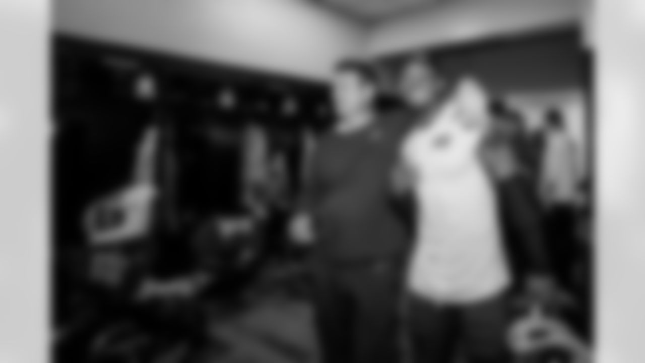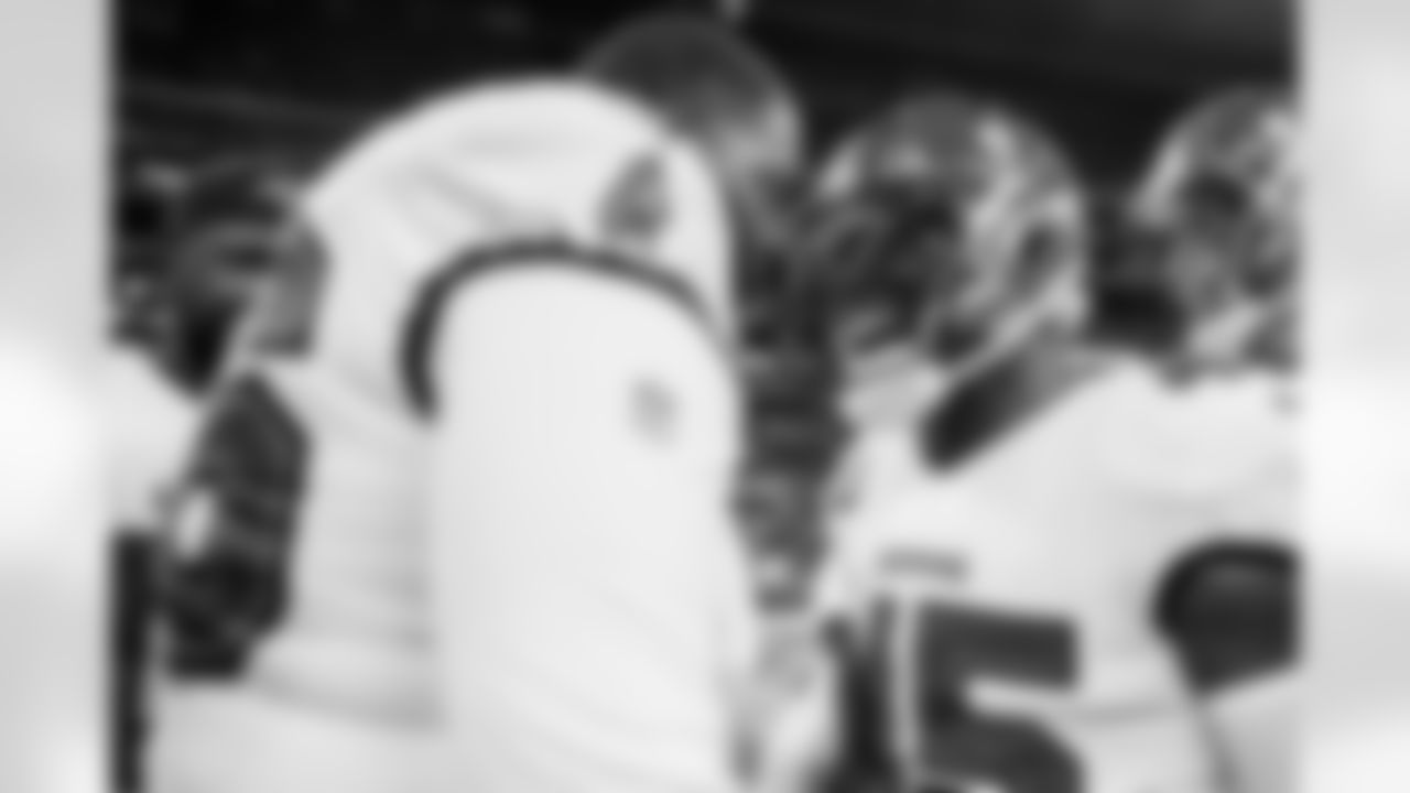 CHARLOTTE, NC - DECEMBER 26, 2021 - Safeties Coach Nick Rapone and Safety Jordan Whitehead #33 of the Tampa Bay Buccaneers after the game between the Tampa Bay Buccaneers and Carolina Panthers at Bank of America Stadium. The Buccaneers won the game, 32-6. Photo By Tori Richman/Tampa Bay Buccaneers