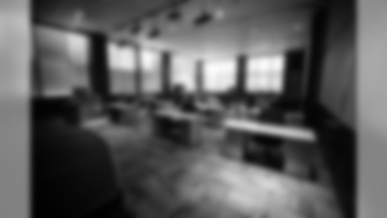 TAMPA, FL - JULY 23, 2020 - The offensive line classroom is moved into the media studio to adhere to league safety protocols during the COVID-19 pandemic. Photo By Kyle Zedaker/Tampa Bay Buccaneers