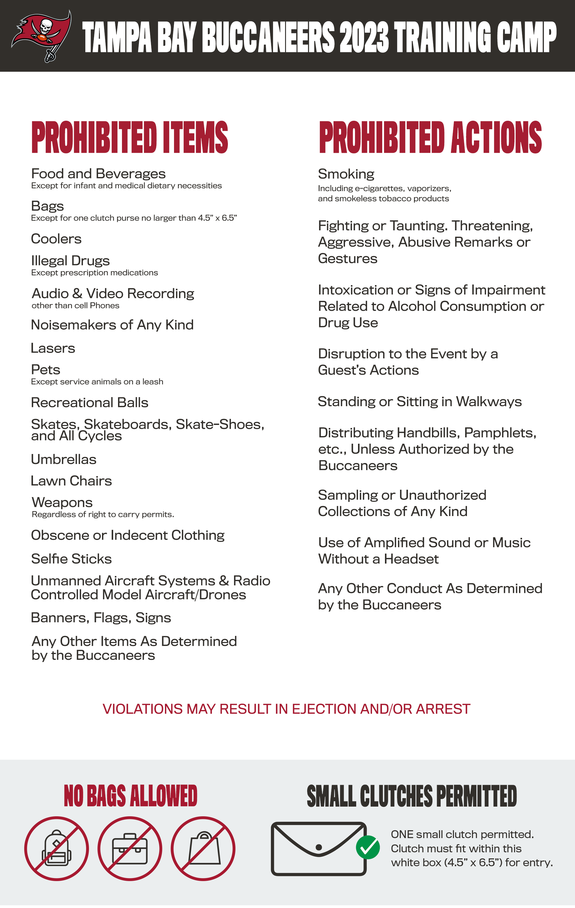 - A no-bag policy will be in effect for Training Camp with the exception of small clutch-style purses 4.5" x 6.5"